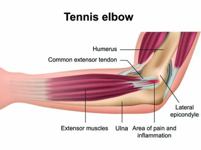 Tennis elbow can also be caused by overuse. The tendon associated with the condition can be strained through any activity that stresses its attachments. For example, activities involving gripping (e.g., grasping a tennis racket) and repetitive motion (e.g., weaving, painting, auto repair) can also create stress.